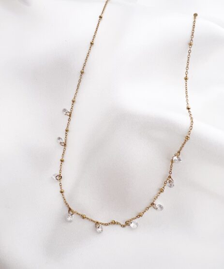 Κολιέ με λευκά κρύσταλλα από ανοξείδωτο ατσάλι. Έχει ρυθμιζόμενο κούμπωμα και μπορείτε να φορέσετε το κολιέ από 39 cm έως 46 cm.