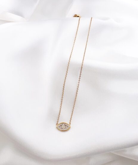 Το κολιέ είναι κατασκευασμένο από ανοξείδωτο ατσάλι σε χρυσό χρώμα και κρύσταλλo και έχει ρυθμιζόμενο κούμπωμα. Χάρη σε αυτό το κούμπωμα μπορείτε να φορέσετε το κολιέ από 41 cm έως 46 cm.