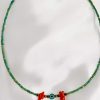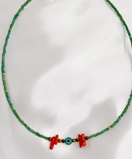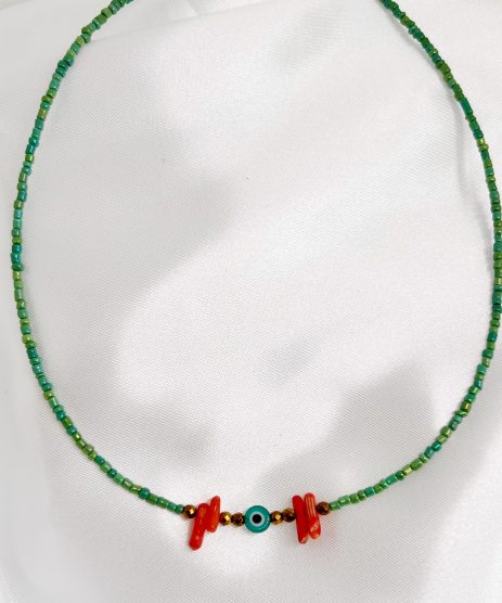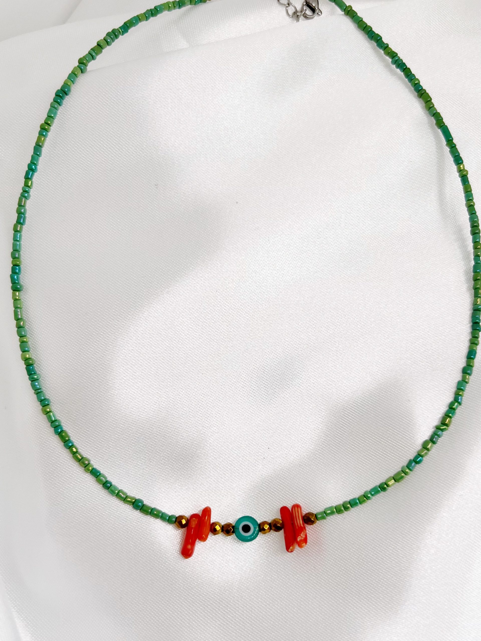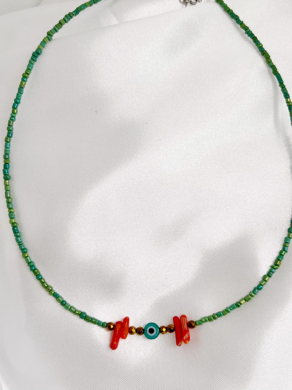 Κολιέ με πράσινες ιριδίζον χάντρες mermaid . Πράσινο γυάλινο ματάκι, ημιπολύτιμες πέτρες χρυσού αιματίτη και πορτοκαλί chips κοραλλιού. Έχει ρυθμιζόμενο κούμπωμα και μπορείτε να φορέσετε το κολιέ από 39 cm έως 46 cm.