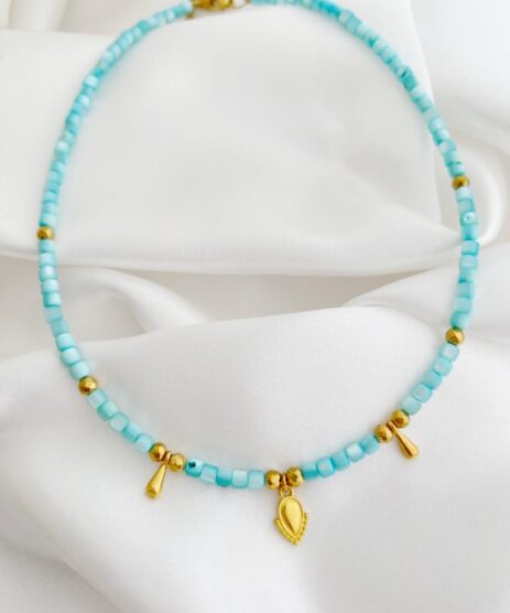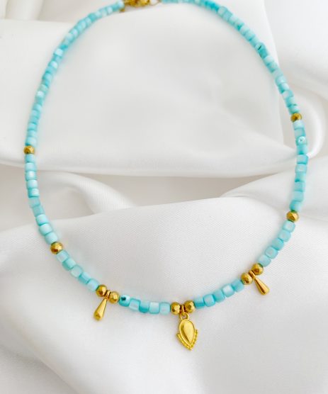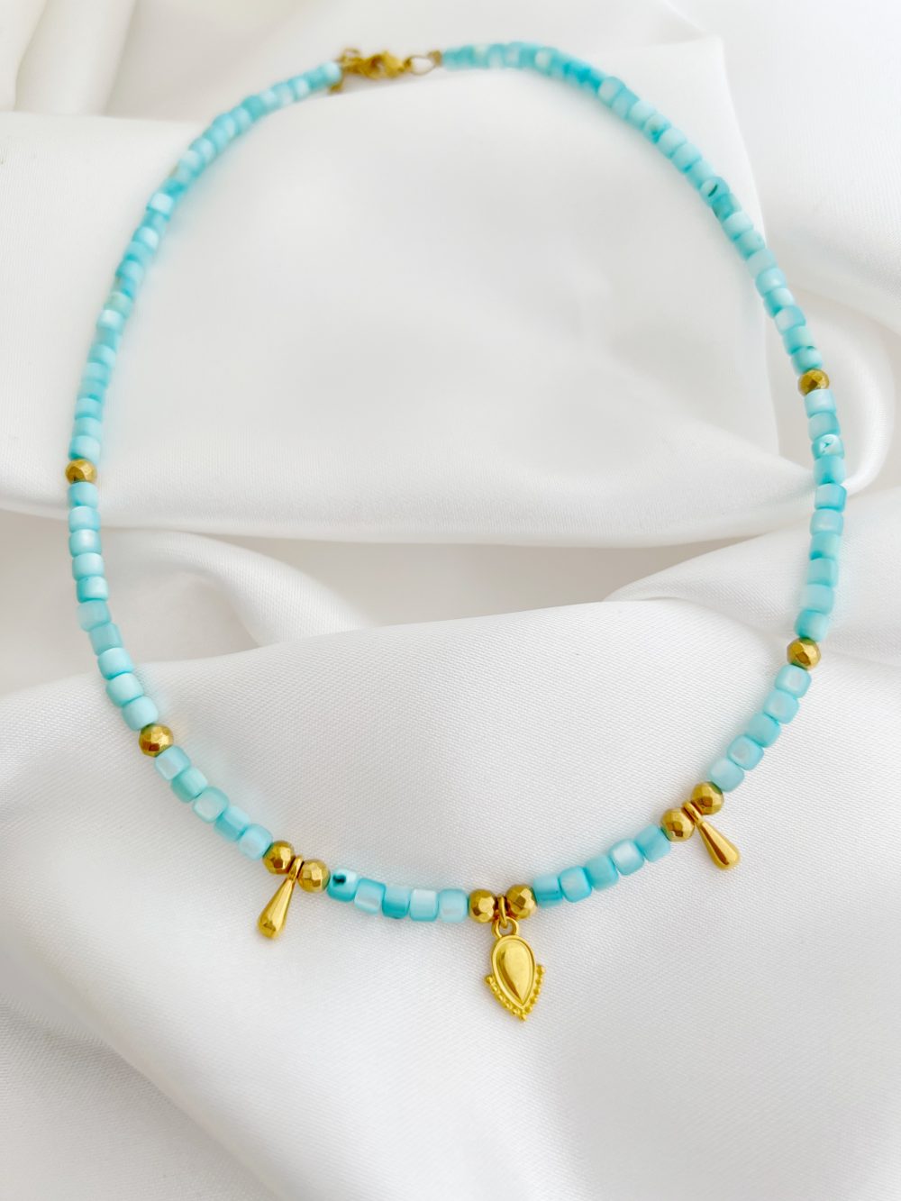Κολιέ, με ημιπολύτιμες τυρκουάζ πέτρες, χρυσό αιματίτη και χρυσό μοτίφ δάκρυ