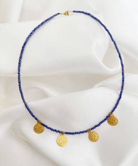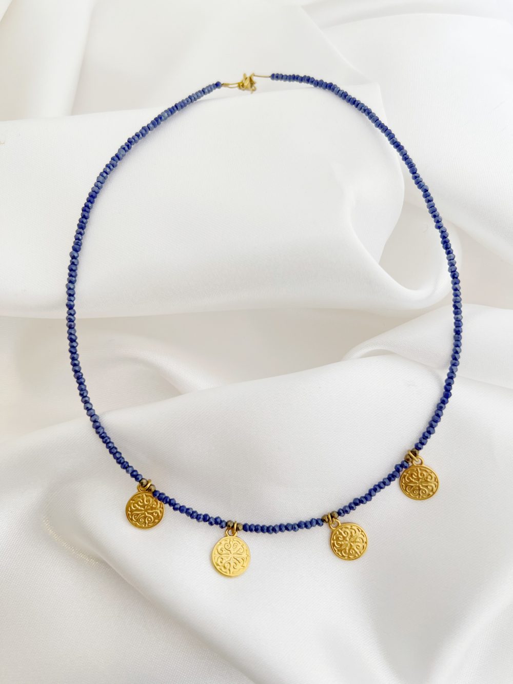 Κολιέ με μπλε πέτρες γυάλινες, χρυσό αιματίτη και χρυσά φλουριά
