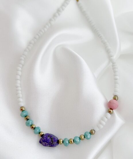Κολιέ, με λευκές χάντρες, χρυσό αιματίτη και ημιπολύτιμη πέτρα αμέθυστος