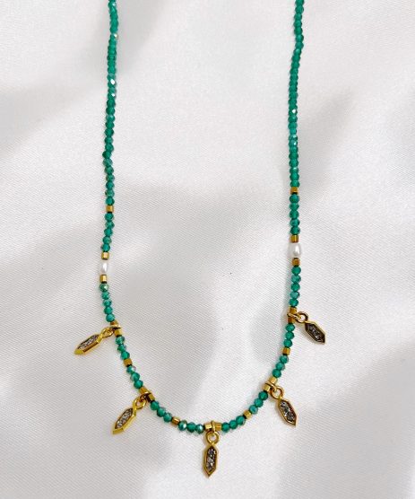 Κολιέ με σμαραγδί πράσινες γυάλινες χάντρες, στοιχεία από επιχρυσωμένο ασήμι 24k (διπλής όψης), ημιπολύτιμες πέτρες φίλντισι και χρυσό αιματίτη. Έχει ρυθμιζόμενο κούμπωμα και μπορείτε να φορέσετε το κολιέ από 39 cm έως 46 cm.
